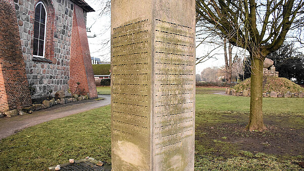 Am 18. November 1990 wurde die vom Mecklenburger Bildhauer Axel Peters (geboren 1944) gestaltete Anlage eingeweiht. Sie besteht aus zwei Stelen aus Elbsandstein, die zu beiden Seiten eines Weges unmittelbar hinter der Kirche platziert wurden. Eine der Stelen trägt die Namen beziehungsweise Häftlingsnummern von 34 Frauen und eines 33 Tage alten Säuglings. Sie kamen im Außenlager Sasel des KZ Neuengamme ums Leben, und waren auf dem Bergstedter Friedhof bestattet, bis sie im März 1957 auf den Ohlsdorfer Friedhof umgebettet wurden. Die zweite Stele liegt zerbrochen auf der anderen Seite des Weges und trägt die von Bundespräsident Richard von Weizsäcker in seiner Ansprache zum 8. Mai 1985 zitierte jüdische Weisheit: „Vergessen verlängert das Exil, sich erinnern ist das Geheimnis der Erlösung.“
